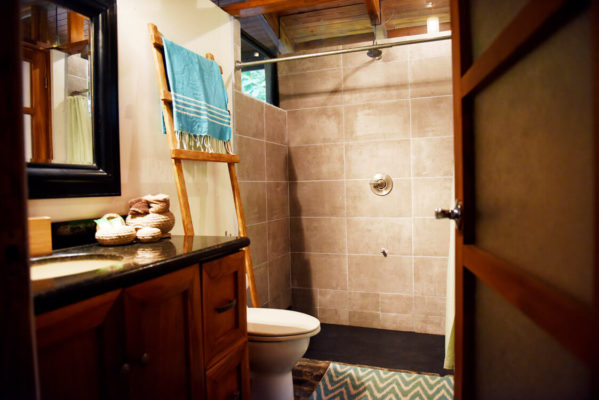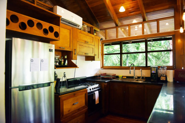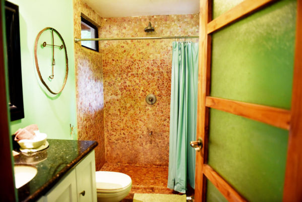 This 3 bedroom, 2 bathroom house features a private pool, a wraparound deck and outdoor lounging areas in a lush jungle setting. Casa Sabura is custom built with floor to ceiling windows surrounding the house. The master bedroom features a king size bed, the second upstairs bedroom has two twin beds. Each room has a sliding door which leads to the wraparound deck. Both rooms are equipped with their own independent A/C units. The third bedroom, located on the ground floor, features a queen size bed and is adjacent to the second bathroom with a shower.